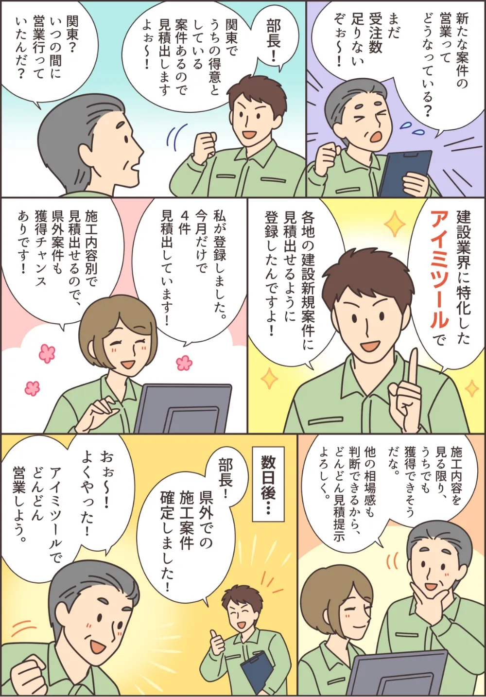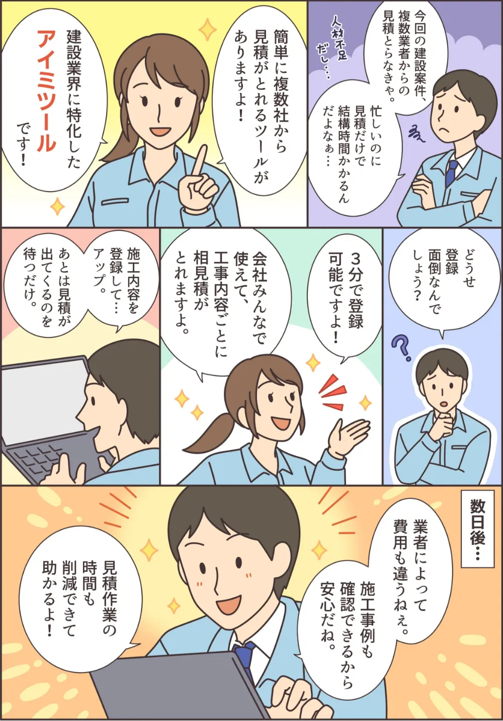 「アイミツール」は、もっと手軽に見積もりを取りたい、下請業者を探したい発注者様、および、中長期的な仕事を確保したい、エリアを拡大して現場を探したい受注者様、双方の課題を解決するために、直接見積もりを送ることができるプラットフォームです。